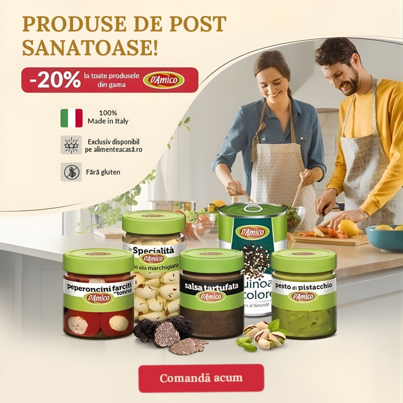 De la AlimenteAcasa puteti comanda simplu si rapid. Va delectam cu arome diverse, cu o gama larga de produse, de la cele de baza pentru anumite preparate, pana la condimente, pentru a potenta aromele. Cu ce veti gasi disponibil aici veti putea prepara meniuri complete, gustari, feluri principale si pana la deserturi. Fiti mereu pregatiti, cu alimente de calitate, aduse din inima Italiei, pentru cei care isi doresc sa se bucure de gustul autentic italian, oriunde si oricand.