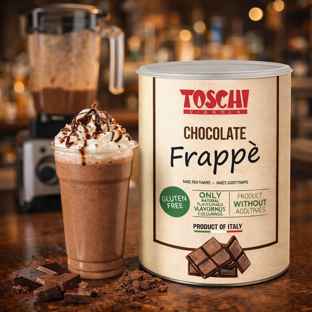 Baza pentru Frappe de Ciocolata este baza ideală pentru frappé-uri și băuturi pe bază de ciocolată, cu un gust intens și cremos. Cu 28% ciocolată pudră și cacao de calitate, acest produs profesional adaugă aromă bogată și textura perfectă băuturilor tale reci. Ideal pentru cafenele, gelaterii și preparate HoReCa. Produs fara gluten.