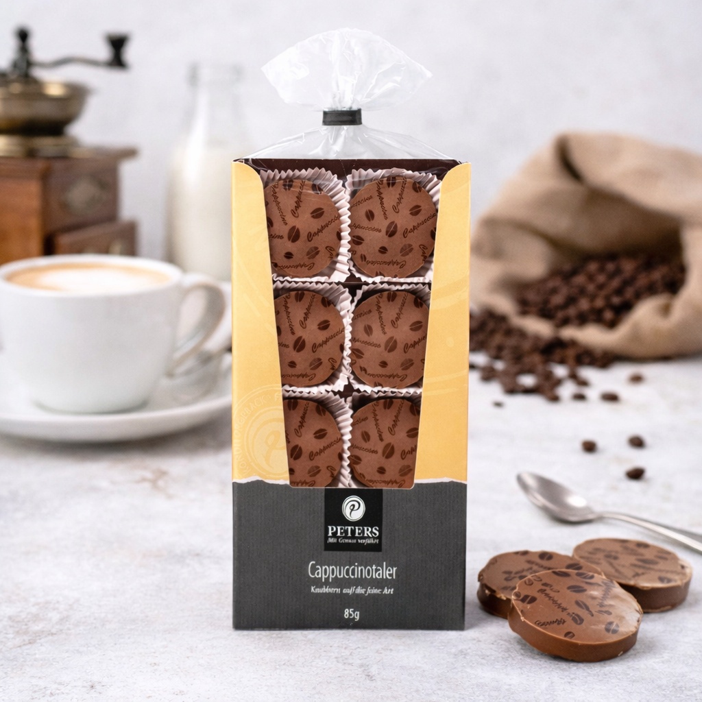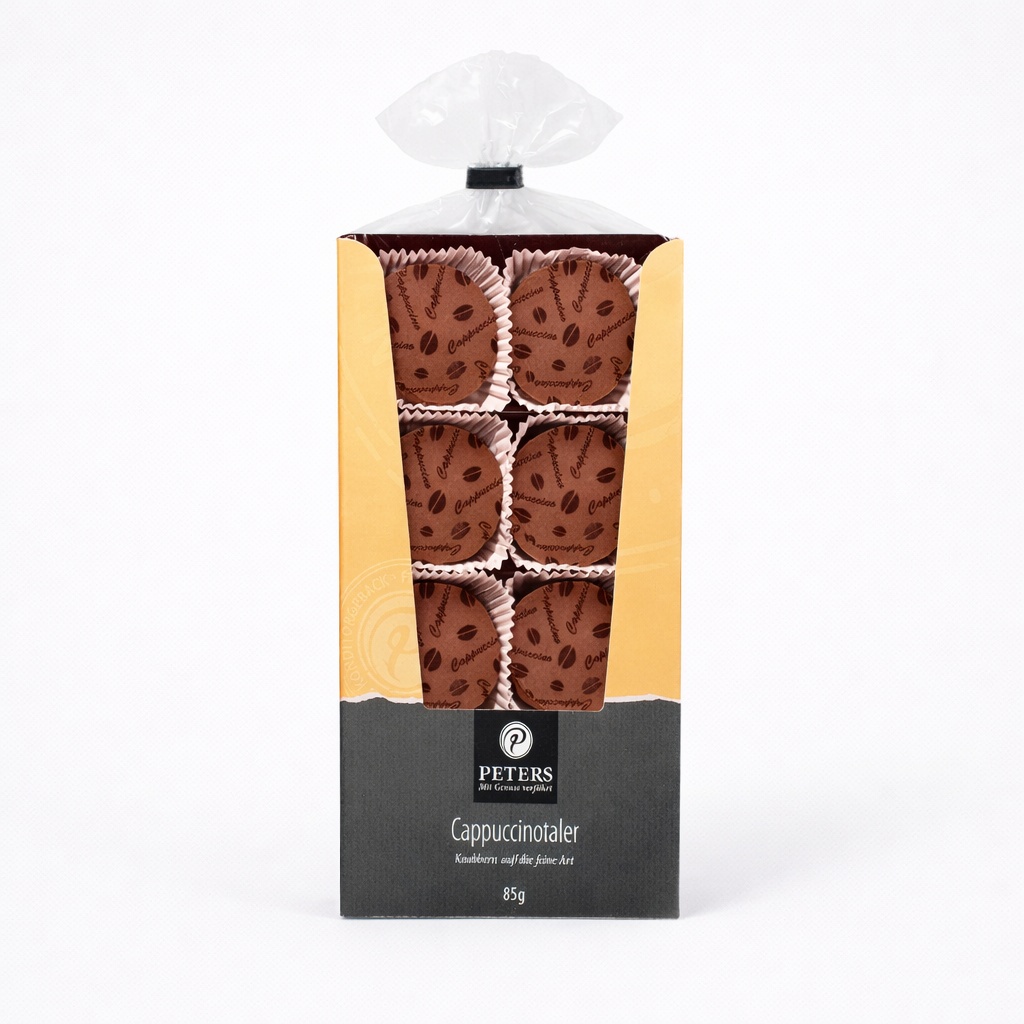 Cappuccinotaler Peters sunt biscuiți premium tip teegebäck, creați pentru a completa perfect ritualul cafelei. Un aluat fraged cu unt, îmbogățit cu note intense de cafea din America Latină, este acoperit cu un strat generos de ciocolată belgiană cu lapte, cu minimum 35% cacao.