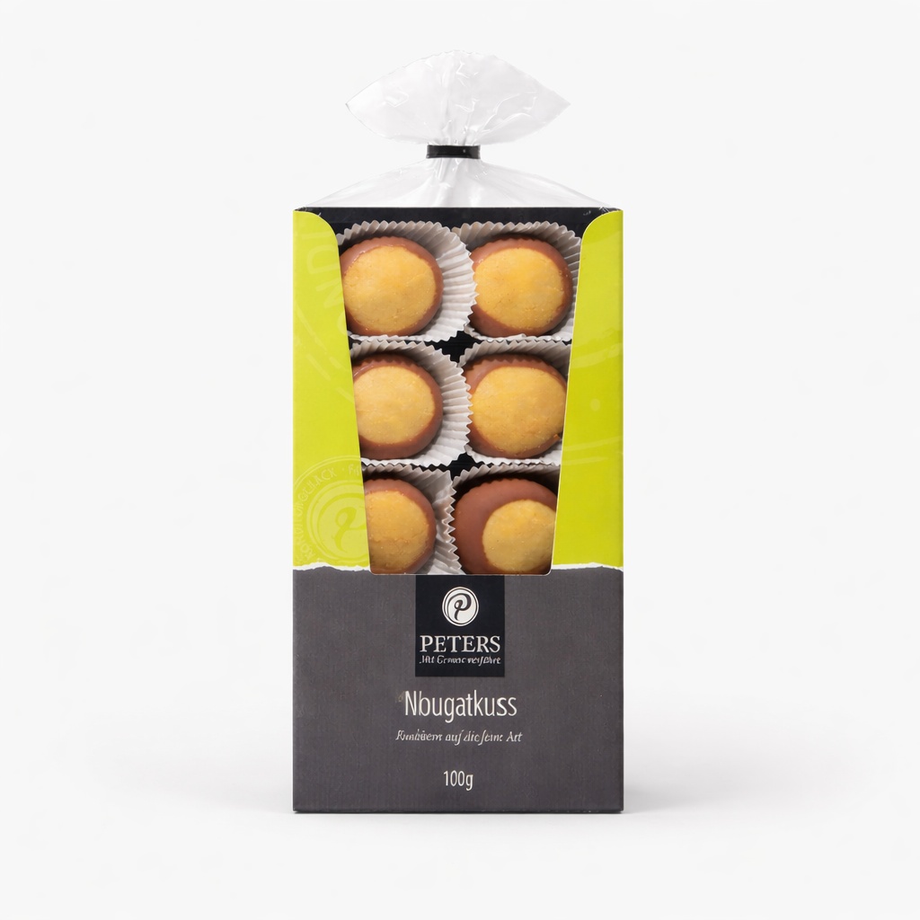 Nougat-Kiss Peters 100 g este o declarație de răsfăț și eleganță, ideală pentru a fi oferită de 1–8 Martie. Fursecuri fine cu umplutură generoasă de nougat cremos din alune de pădure, coapte cu vanilie Bourbon autentică și îmbrăcate în ciocolată cu lapte belgiană fină.