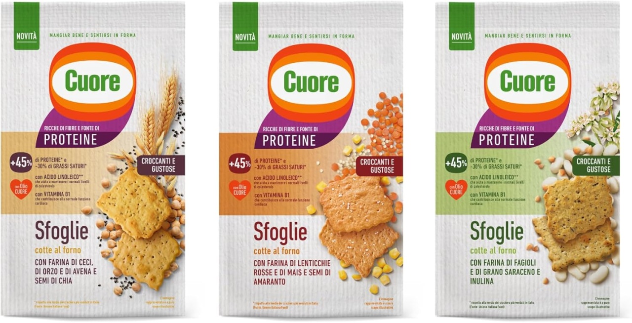 Cuore Crackers biscuiti crocanti din făină de fasole, proteine din mazăre și hrișcă. Inulina este prezentă, o fibră prebiotică, care ajută la menținerea echilibrului florei bacteriene intestinale.