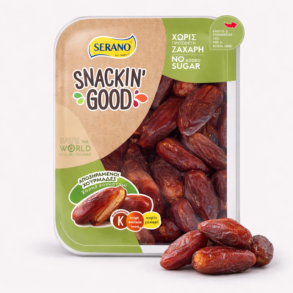 Bucură-te de gustul natural dulce și textura moale a curmalelor uscate Serano Snackin’ Good, o gustare sănătoasă și energizantă, perfectă pentru orice moment al zilei.