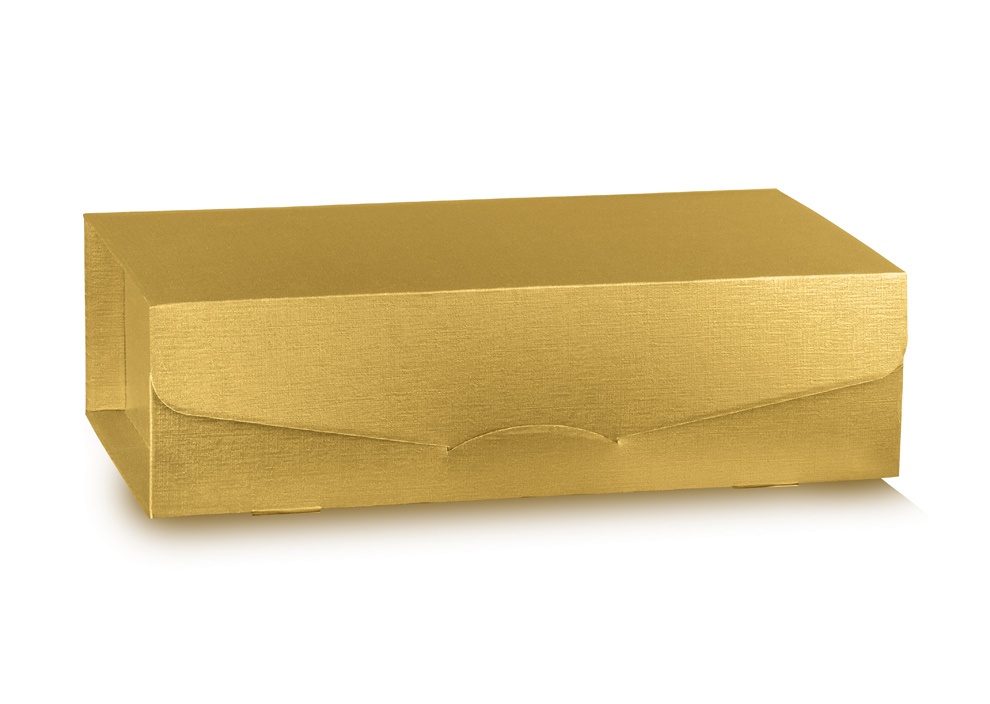 Cutie elegantă din carton rigid, cu finisaj texturat de culoare aurie, ce oferă un aspect sofisticat și festiv. Perfectă pentru ambalarea produselor gourmet, a accesoriilor, seturilor cosmetice sau a cadourilor corporate.