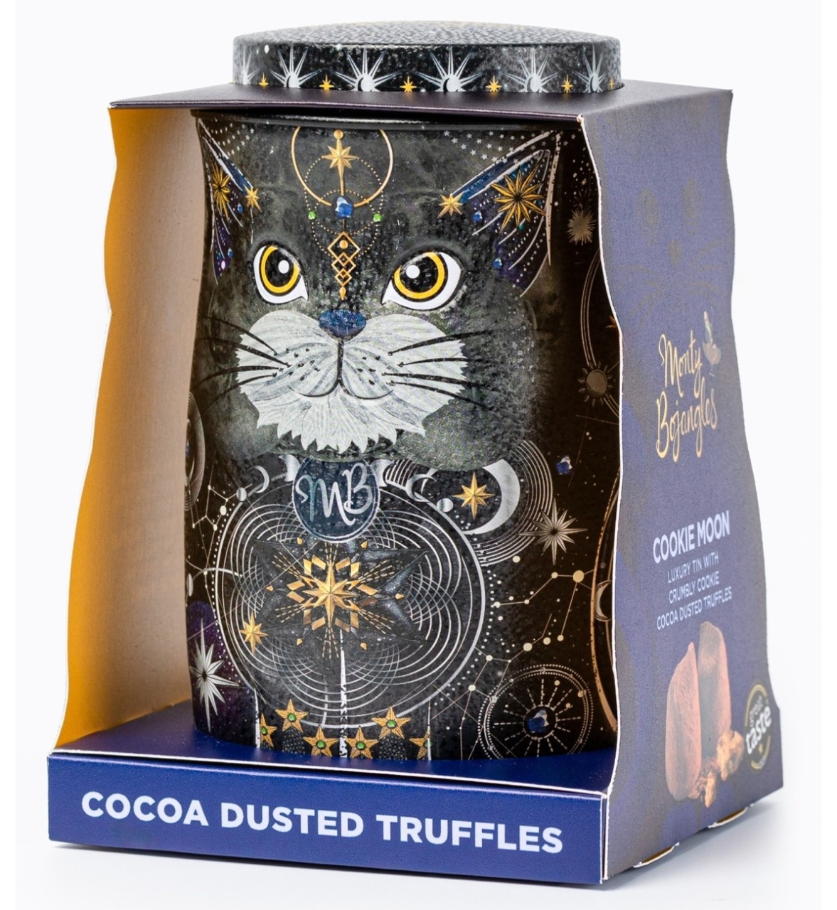 Intră în universul rafinamentului gustativ cu Monty Bojangles Cosmic Blink Cat Tin. Fiecare trufă este realizată cu grijă, cu o bază de cacao redusă în grăsimi, uleiuri vegetale şi bucăţi de biscuit crocant (~9 %) care adaugă o textură deosebită. Pudrate generos cu cacao, aceste trufe livrează o experienţă bogată şi memorabilă. Ambalajul deosebit — o cutie metalică în formă de pisică, cu o grafică „cosmică” sofisticată — este ideal pentru colecţionare sau pentru a fi oferit cadou.