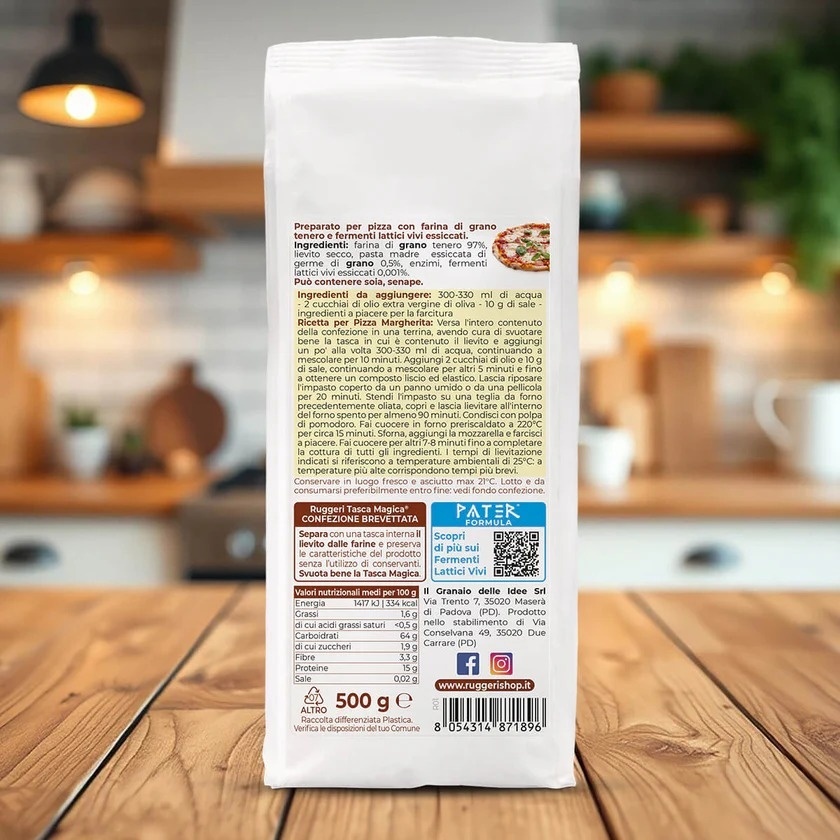 Ruggeri Preparato Completo per Pizza 500g este soluția ideală pentru o pizza autentică, gustoasă și ușor de preparat acasă. Acest mix complet conține făină de grâu atent selecționată, maia uscată din germeni de grâu, drojdie și fermenti lactici vii uscați, pentru un aluat stabil, elastic și ușor de lucrat.