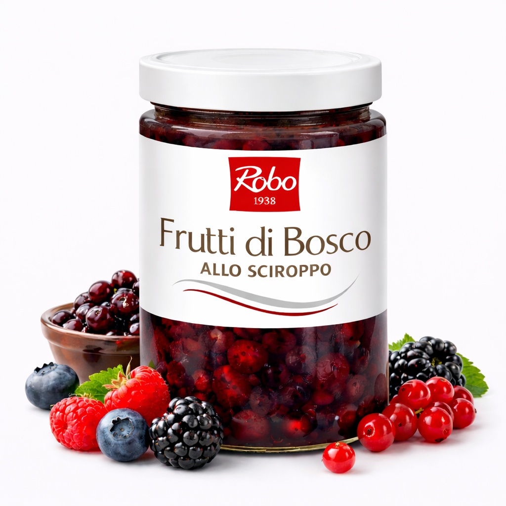 Frutti di Bosco ROBO este un amestec delicios de afine, zmeură, coacăze roșii și mure, conservate în propriul suc cu adaos de zahăr brun, pentru un gust intens, natural și echilibrat.