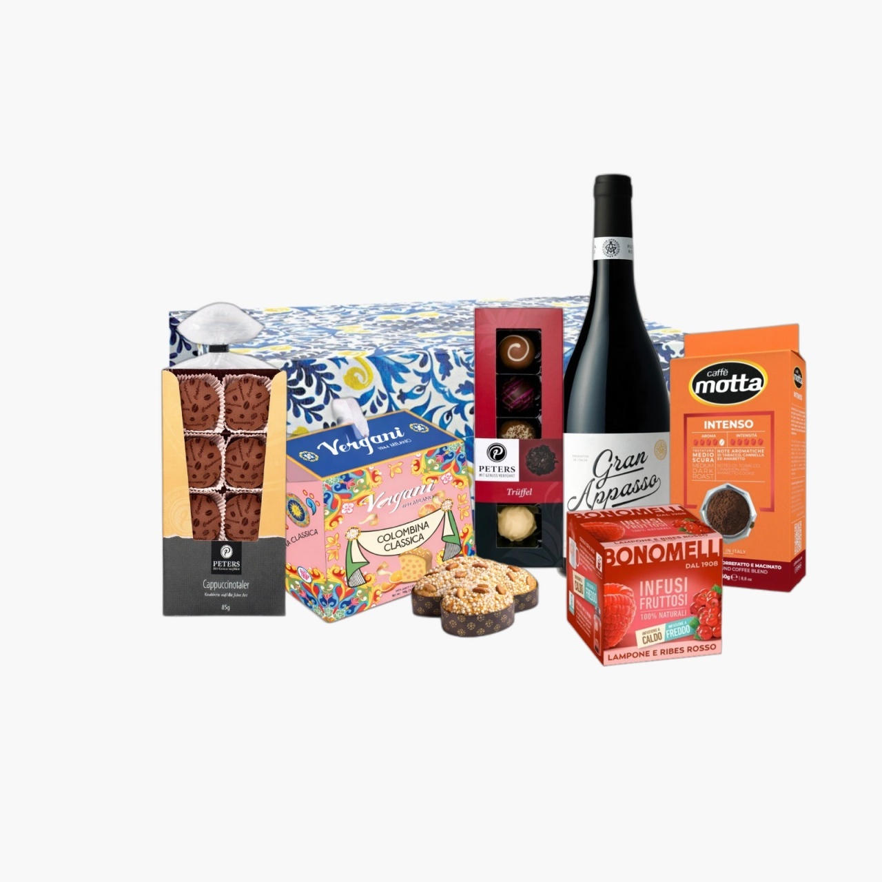 Răsfață-ți simțurile cu un cadou elegant ce combină vinul roșu Gran Appasso cu produse gourmet atent selecționate, acum completate cu un ceai din plante cu zmeură și coacăze roșii Bonomelli, pentru momente de relaxare perfecte. Acest pachet este ideal pentru iubitorii de vin, cafea, ceai și deserturi fine, potrivit pentru sărbători, evenimente speciale sau momente de răsfăț.