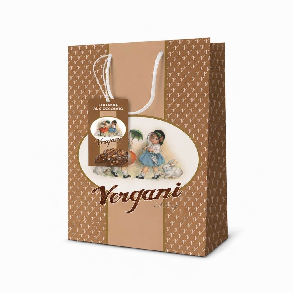 Colomba este prezentată într-o pungă verticală maro, cu design elegant și rafinat, perfectă pentru a fi oferită cadou. Aspectul premium o transformă într-o alegere ideală pentru coșuri pascale sau cadouri corporate de Paște.