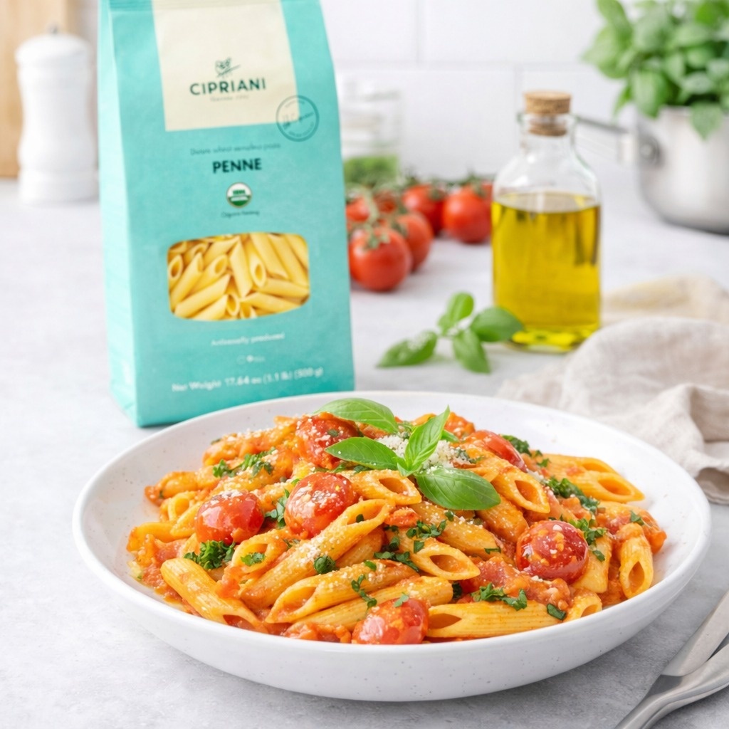 Penne Grau Dur Bio Bellini Cipriani 500g sunt paste italiene premium, obținute din grâu dur ecologic atent selecționat, pentru un gust autentic și o textură perfectă „al dente”. Forma clasică de penne, cu tăietură oblică, este ideală pentru a reține sosurile și pentru a oferi consistență fiecărui preparat.