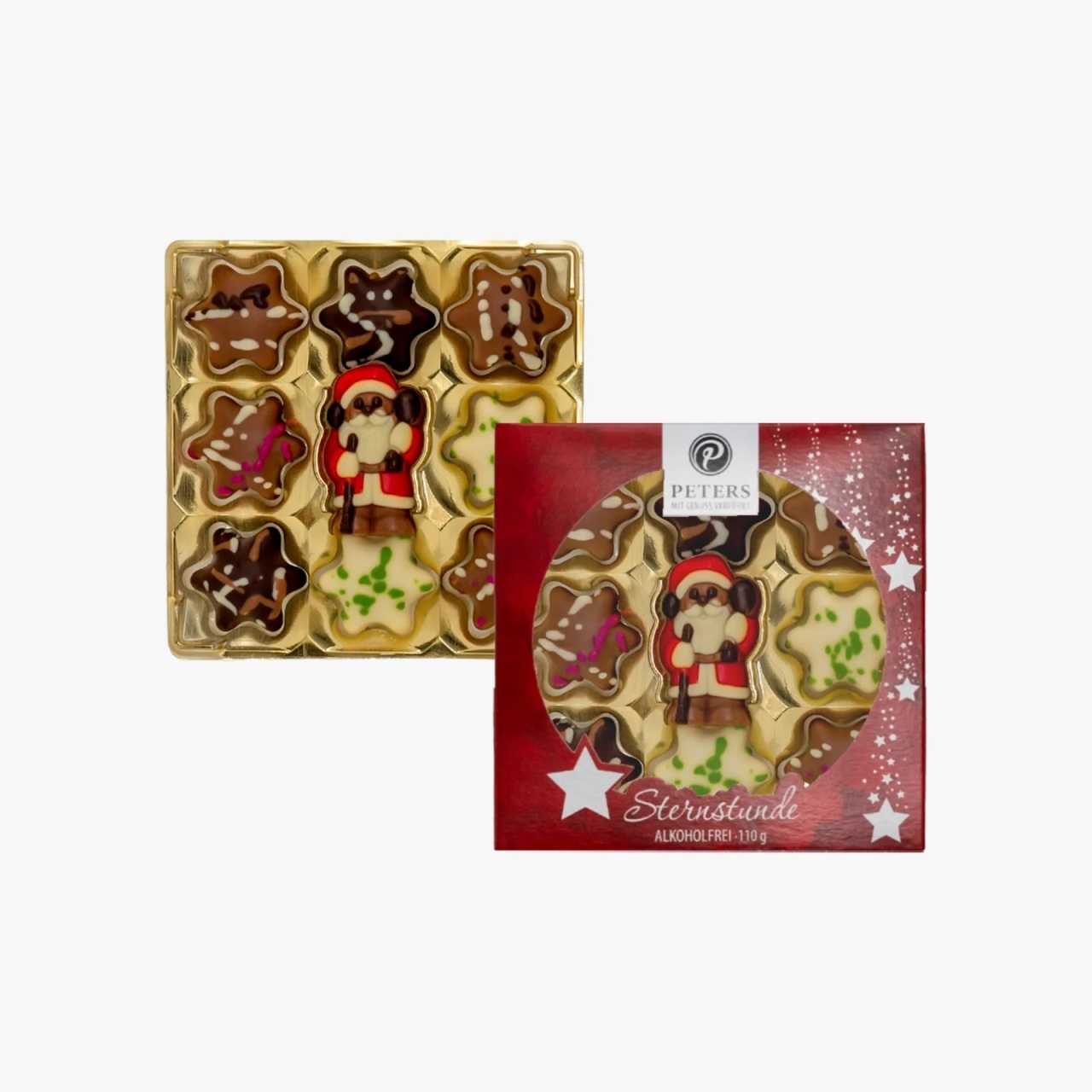 Sternstunde este o selecție festivă de praline fine Peters, perfectă pentru a aduce spiritul sărbătorilor în fiecare casă. Un simpatic Moș de ciocolată este înconjurat de 8 mini-praline în formă de stea, în diverse arome delicioase – fiecare sortiment este prezent de două ori.