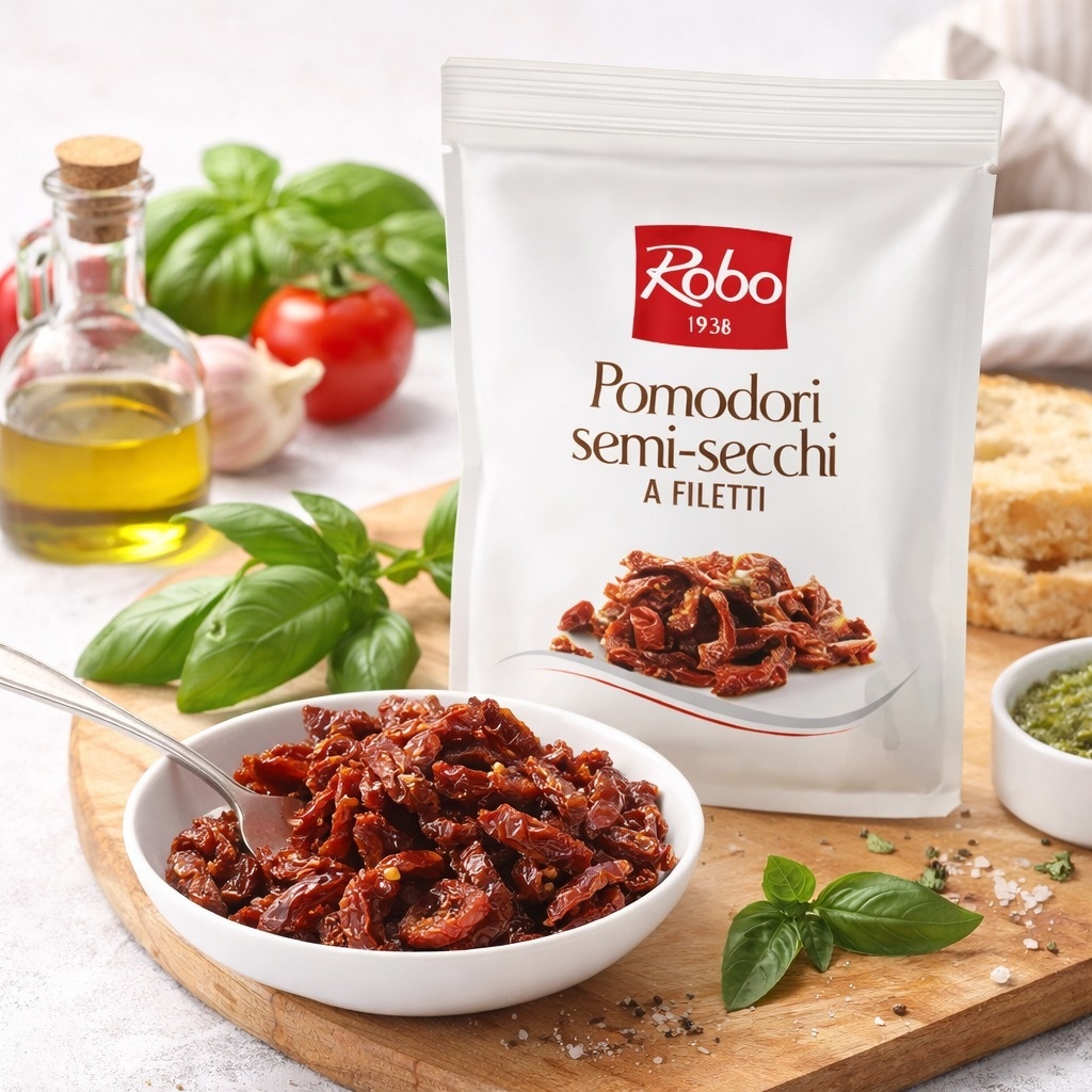 Roșii semi-uscate feliate în ulei de floarea-soarelui Robo 1100g oferă un ingredient practic, aromat și versatil, perfect pentru bucătăriile profesionale care caută calitate constantă și eficiență în preparare.