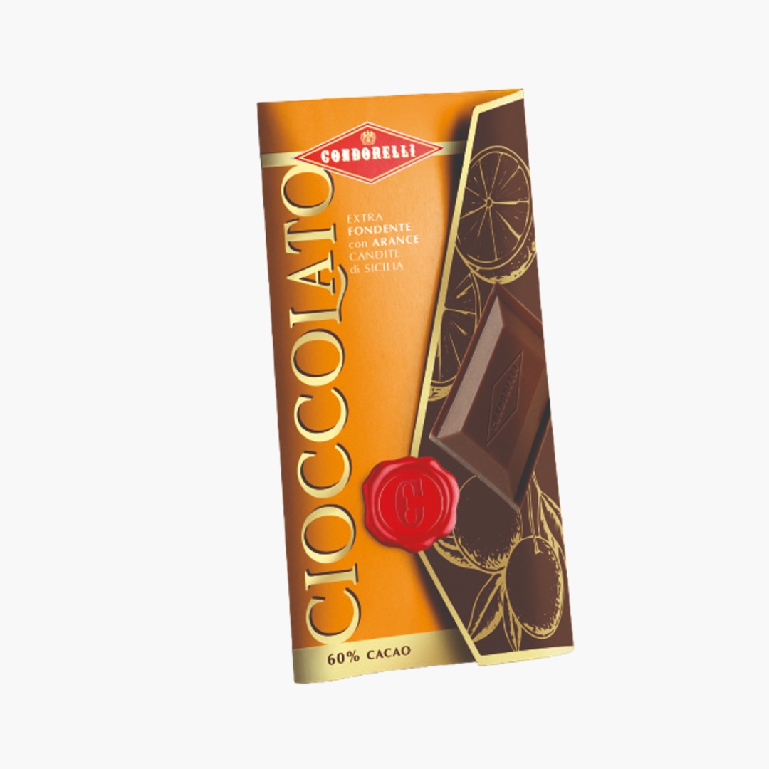 Descoperă eleganța gustului italian cu Tableta de ciocolată neagră Condorelli 60% cacao cu portocale confiate din Sicilia.